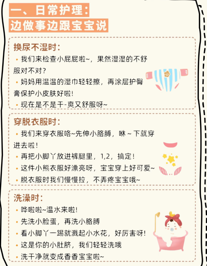 很多新手爸妈面对不会说话的小婴儿,总觉得自己在唱独角戏,憋了半天只能挤出“宝宝好乖”“啊啊呀呀”之类的简单词汇,然后陷入尴尬的沉默。其实你可别小看这个小听众,婴儿的大脑正处在飞速发育的黄金期,你跟他说的每一句话,都在帮他搭建语言理解能力和社交情感的桥梁。那么到底该聊什么?答案其实很简单——聊你正在做的一切。